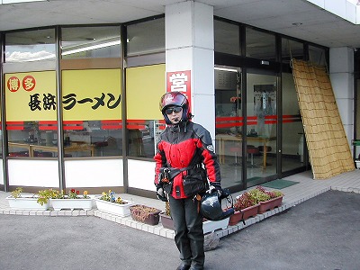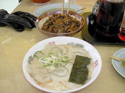 午後 02:00 ラーメン屋さんのご主人が「辛子高菜」をちょっと入れると、 一段と美味しくなるよと、持ってきてくれたので入れたところ、ホントに 美味しくなりました。この日から九州も寒くなり、冷えた身体には最高の ラーメンでした。とてもいいラーメン屋さんで、「レーシングショップカツキ」 さんの場所を教えていただいたり、フェリーの中で食べなさいと柿を一袋 いただきました。ありがとうございました。 |