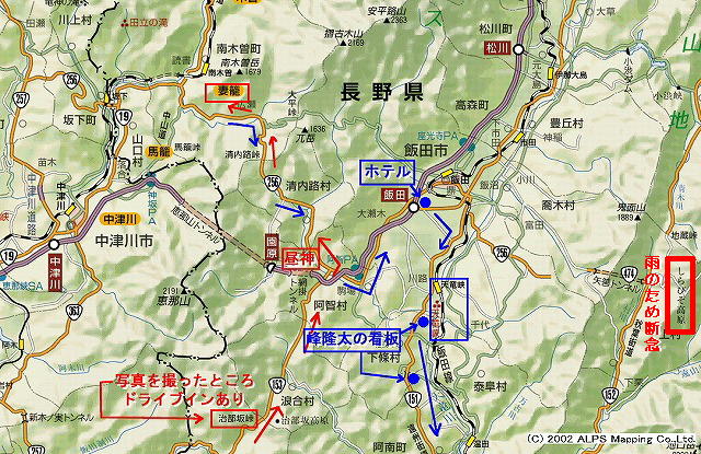 ![]() 2004/07/18 本日のルート、当初はしらびそ高原へ行く予定でしたが、雨のため予定変更して天竜峡へ向かいます。 |