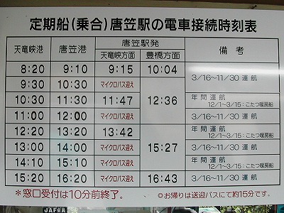![]() 乗合船の時刻表です。団体客だと貸し切りの増便が出ます。 |