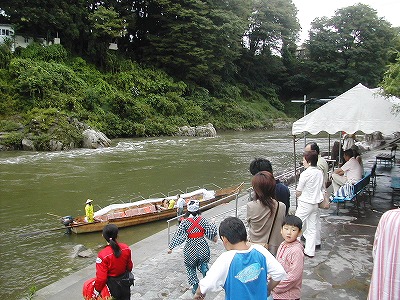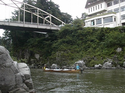 ![]() この日は大雨のため水量が多く、流れも速いです。 船頭さんが、投網で鮎などを捕ってくれるそうです。 |