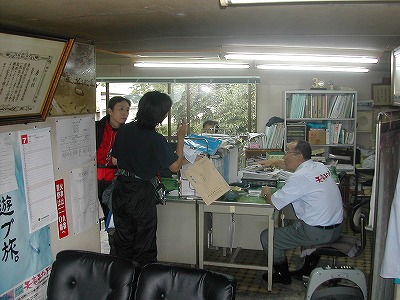 ![]() 天竜ライン下りの事務所で、取材中のべに記者。 |