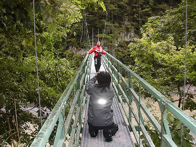 ![]() やまめ荘前には吊り橋が架かっています。 |