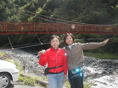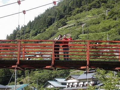 ![]() 午後 12:16 かぐらの湯へ行く途中の、遠山川 (天竜川の支流)に架かる吊り橋の前で。 |