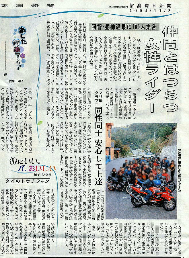 ![]() 11月3日付、信濃毎日新聞に マリ輪ミィーティングの記事が 載りました。 私も新聞記者のインタビューを 受けましたが、その模様が記事になりました。 |