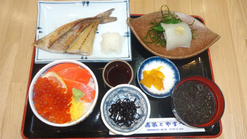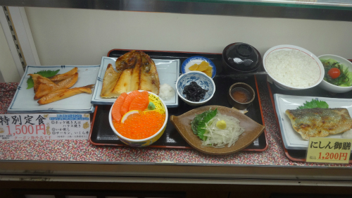 ![]() 私の注文した特別定食\1,500円。 イカも新鮮でたっぷり、海鮮丼もいくらが山盛り、 ホッケも身が厚く、海藻の味噌汁も全てが大満足でした。 |