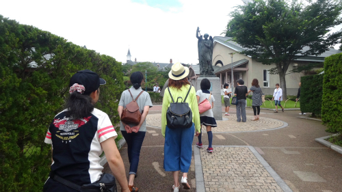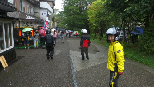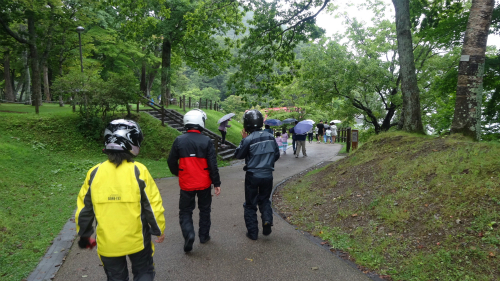 ![]() 雨が降っているのでヘルメットを被ったまま歩いて行きますが、 他の観光客から見たら異様な集団に見えたかも。 ちなみに傘はホテルで借りられるからと、持ってきませんでした。 |