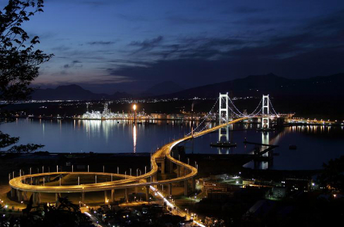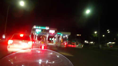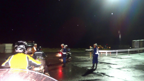 ![]() PM 23:22 フェリーを下りてすぐにカッパを着用します。 これから向かう方向で雨が降っているようです。 |