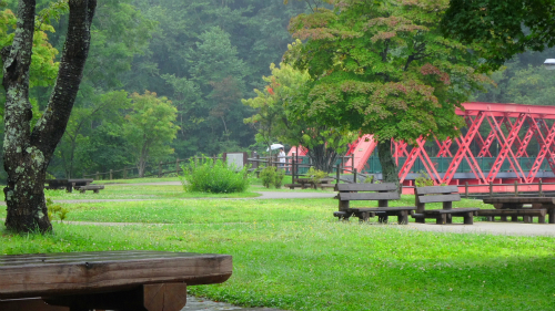 ![]() 所々赤く色づいている葉っぱがありますが、紅葉のはしりでしょうか? その向こうに見える赤い鉄橋は、北海道で一番古い鉄橋だそうです。 |