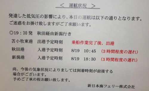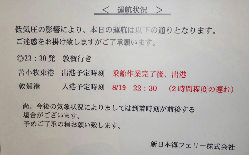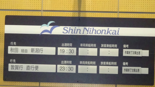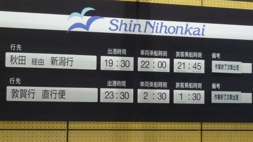 ![]() PM 17:10 ここで係員からショッキングな情報を告げられます。 PM 19:30 発の秋田経由新潟行きフェリーしらかばの到着が遅れており、 敦賀行き出港も3時間ほどの遅れになるそうです。 |