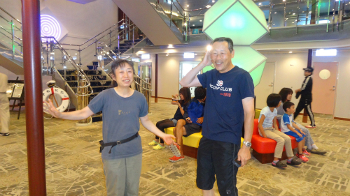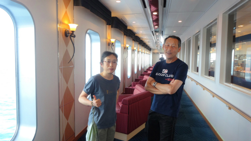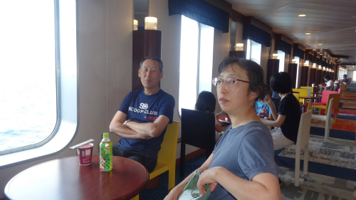 ![]() PM 18:30 そろそろ夕食にしようかと思いましたが、乗船時のドタバタで M@岡崎さん達の部屋番号を聞いていませんでした。探してもドアが 閉まっている部屋へ入るわけにも行かず、携帯電話も圏外で通じ無いため、 船内放送で呼び出して頂き一件落着です。 |