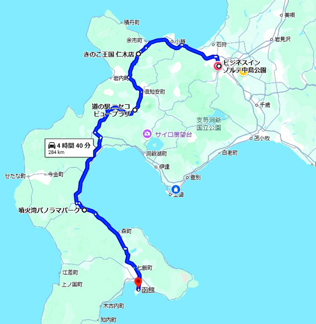 ![]() 2025年7月20日 ツーリング8日目の予定 ニセコルート ビジネスインノルテ中島公園−道の駅ニセコビュープラザ(1 時間41分(86.1 km))− @案 HANAZONOサマーゴンドラ(21分(16.6 km))−噴火湾パノラマパーク(1 時間46分(114 km)) A案 ニセコアンヌプリサマーゴンドラ(29分(12.9 km)アンヌプリゴンドラ 山頂駅) −(1 時間47分(104 km 噴火湾パノラマパーク))− ルートイングランティア函館駅前(1 時間12分(71.4 km)) 合計4時間 59分(289 km) 小樽 積丹ルート ビジネスインノルテ中島公園−小樽市観光駐車場第2(48分(39.8 km))− 道の駅 シェルプラザ・港(1 時間 33分(77.5 km))−八雲 PA (上下集約)(1 時間 15分(86.6 km)) −ルートイングランティア函館駅前(1 時間 15分(86.6 km)) 合計 4時間 44分(274 km) 5月連休までには3つのルートを考えていましたが、 どれも晴天であることが条件のためすべてボツに・・・ ニセコでサマーゴンドラに乗る日は来るのでしょうか。 左の地図は実際のツーリングルートで、 観光無しの移動だけになってしまいました。 |