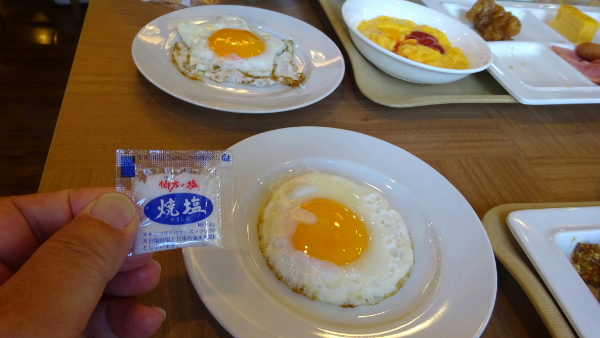 ![]() 目玉焼きには伯方の塩が付いています。 |
