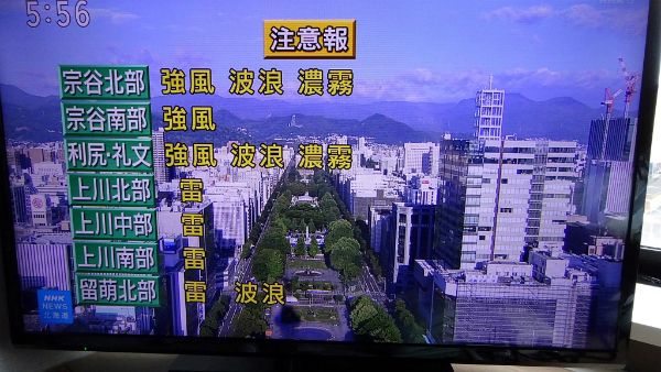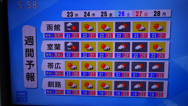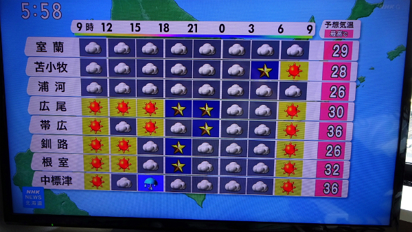 ![]() 北海道最後の日になって、日中初めて太陽マークだけの天気予報です。 |