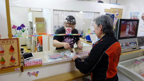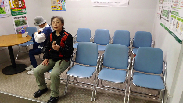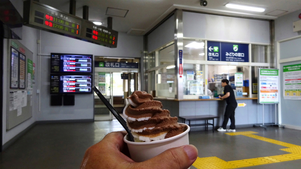 ![]() 駅の待合室でアイスクリームを頂きます。 |
