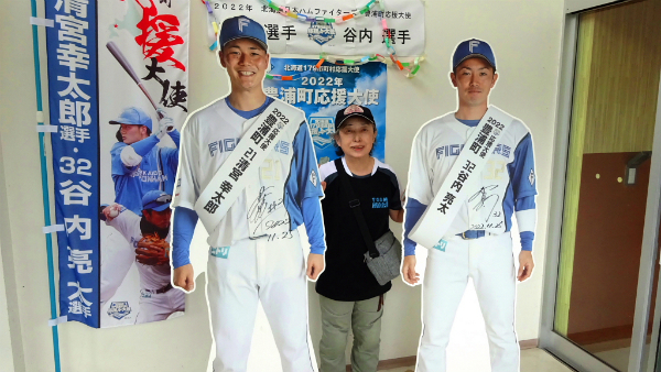 ![]() 日本ハムファイターズの清宮幸太郎選手と谷内亮太選手は、 2022年の豊浦町応援大使と言うことで、サイン入りの等身大パネルがありました。 2018年に大谷翔平選手のパネルと写した写真はこちら。 |