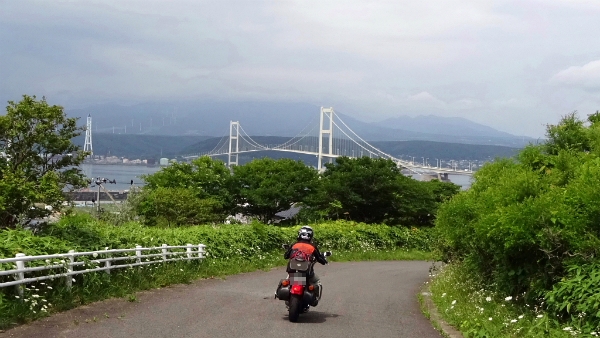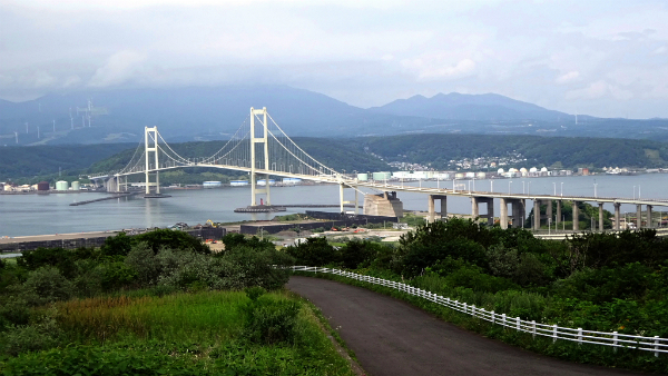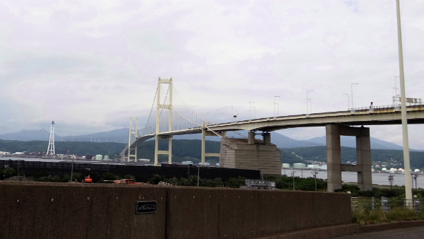 ![]() 大型船が室蘭湾に入るために橋脚は高くなっているので、 橋を降りてくるときはループを大きく回って降ります。 |