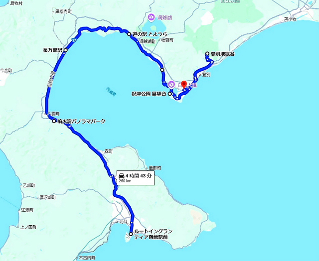 ![]() 2025年7月22日用に当初予定していたツーリングルート。 10日目 A案 7月22日(火) ルートイングランティア函館駅前−噴火湾パノラマパーク(1 時間 24 分(71.4 km))− 道の駅 とようら(1 時間 17 分(74.4 km))− 白鳥大橋 展望台(50 分(38.7 km))− 登別地獄谷 駐車場(45 分(34.0 km))−のぼりべつクマ牧場 駐車場(3 分(750 m))− ホテルルートインGrand室蘭 合計 4 時間 58 分(246 km)(下道のみ) 3 時間 49 分(241 km)(高速利用) 10日目 B案 7月22日(火) ルートイングランティア函館駅前−噴火湾パノラマパーク(1 時間 24 分(71.4 km))− 道の駅ニセコビュープラザ(1 時間 40 分(101 km))− ニセコ・ひらふウェルカムセンター (14 分(10.9 km))−ホテルルートインGrand室蘭(1 時間 52 分(94.3 km)) 合計 5 時間 10 分(278 km) 本日も天気予報は良くないので、必然的にニセコはキャンセルで、 A案一択になってしまいました。 |